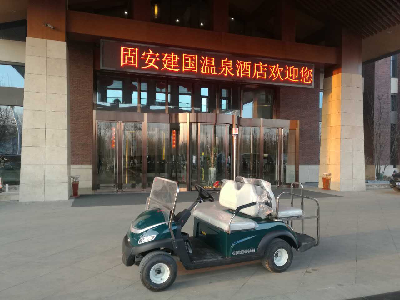 2017年3月8日在河北省廊坊市固安溫泉休閑商務(wù)產(chǎn)業(yè)園交車1臺(tái)四座電動(dòng)觀光車。