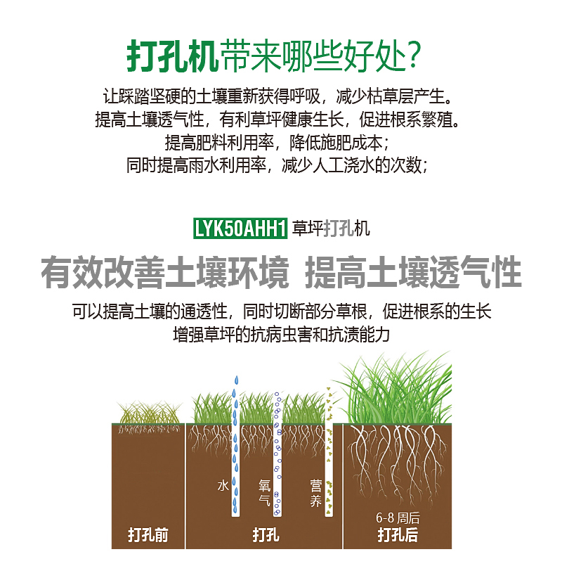 打孔可以切斷部分草根,促進根系的生長,增強草坪的抗病蟲害和抗?jié)n能力。