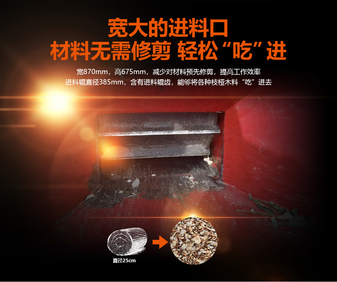 25cm全自動液壓進料粉碎機,選用49馬力環(huán)保柴油發(fā)動機。