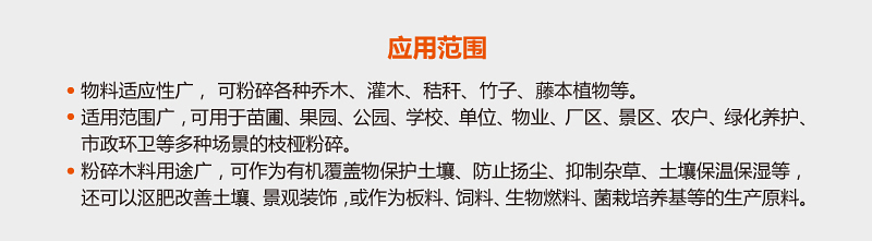 適用范圍廣,可用于苗圃、果園、公園、學(xué)校、單位、物業(yè)、廠區(qū)、景區(qū)、農(nóng)戶、綠化養(yǎng)護、市政環(huán)衛(wèi)等多種場景枝椏粉碎,最大粉碎直徑10cm。